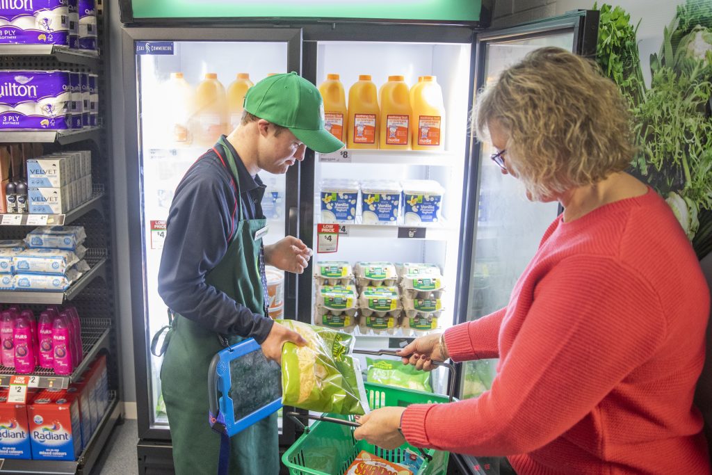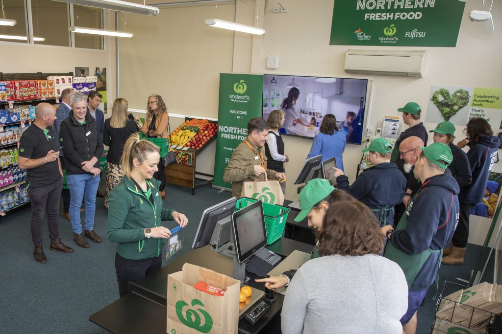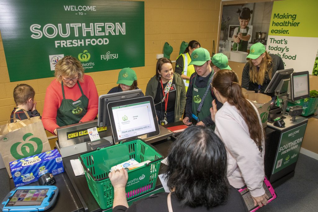 Each mini store is stocked with a range of groceries, fitted with baskets, shelving, ticketing, signage and Woolworths branded uniforms the students can wear to create a fully immersive experience. At check out, grocery items are scanned using fully operational Fujitsu registers and include the experience of money handling, store receipts and the bagging of items.